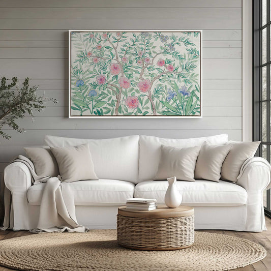 Pink Blossoms and Blue Irises on Green II Canvas Print