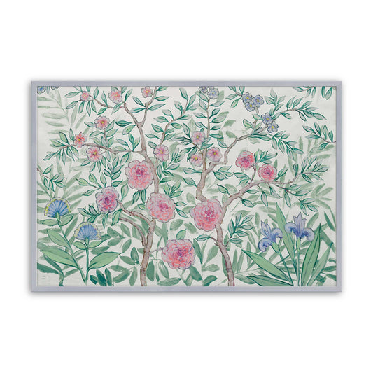 Pink Blossoms and Blue Irises on Green II Paper Print