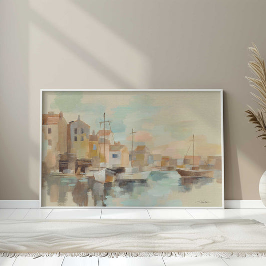 Colorful Coastal Village with Boats and Reflections Paper Print