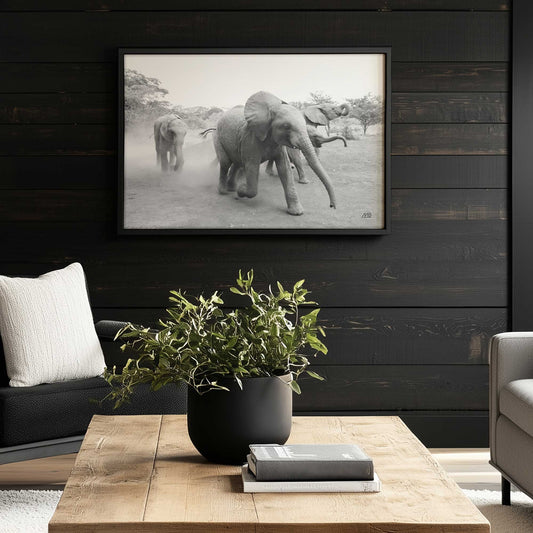 Playful Elephant Herd Running Through the Dust Paper Print