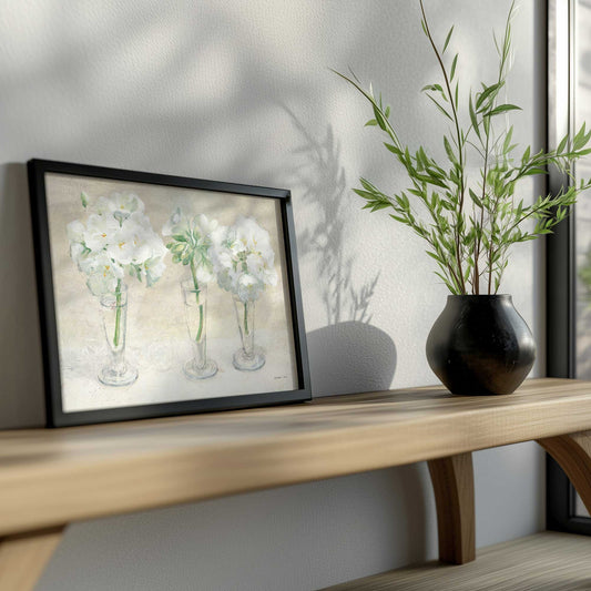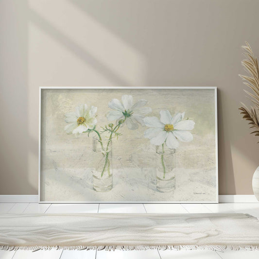 White Blooms in Glass Vases I Paper Print