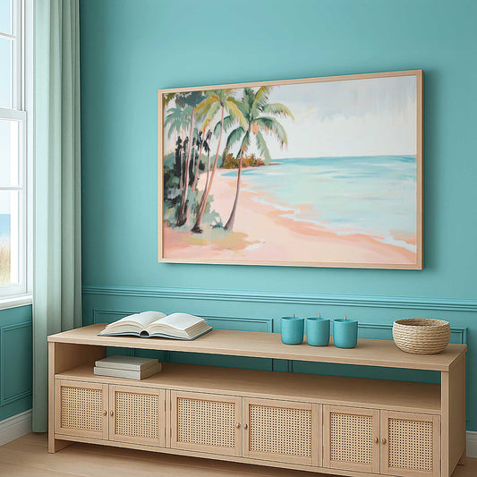 Soft Sunset Beach with Palm Trees and Coral Sand Art Print