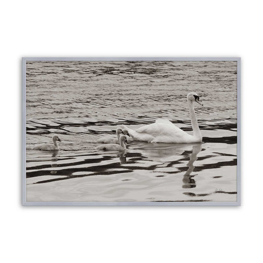 Sepia Swan with Cygnets Gliding Across Calm Water Paper Print