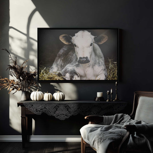 Sweet Baby Calf Lounging in the Hay with Curious Eyes Paper Print