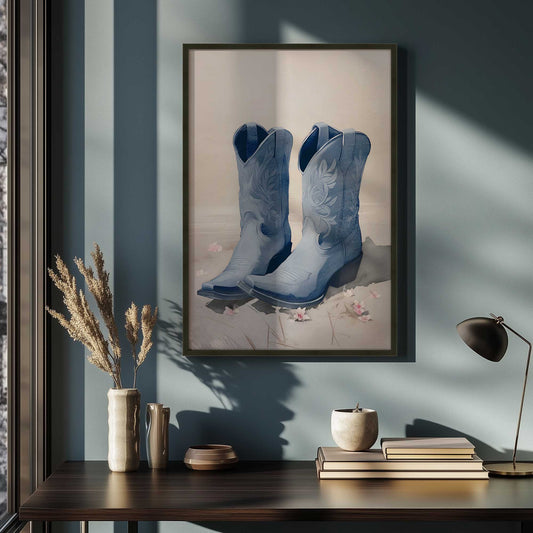 Western Boots Wild Roots in Blue Art Print