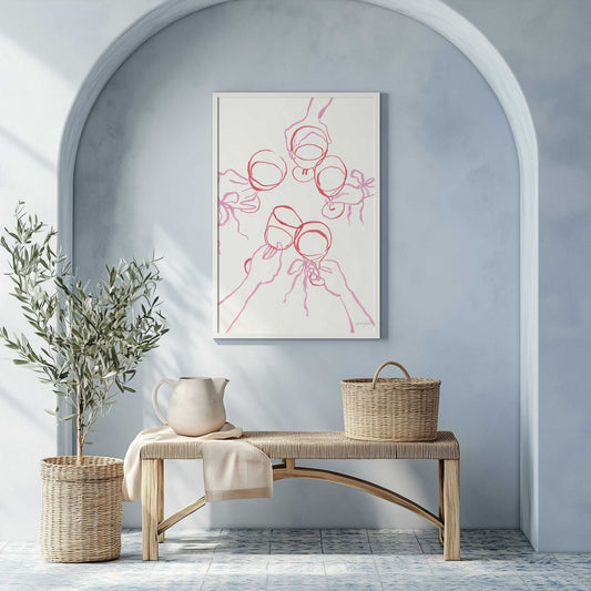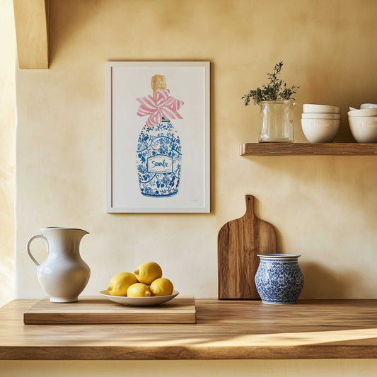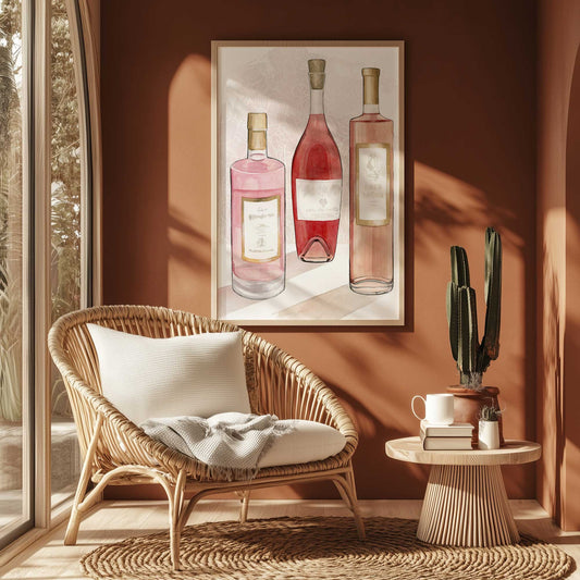 Trio of Rosé Wine Bottles with Soft Floral Background I Art Print