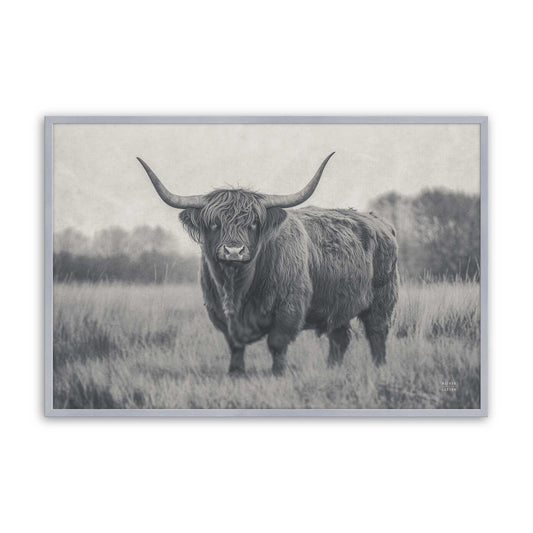 Highland Cow Standing in a Frosty Field on a Misty Morning I Paper Print