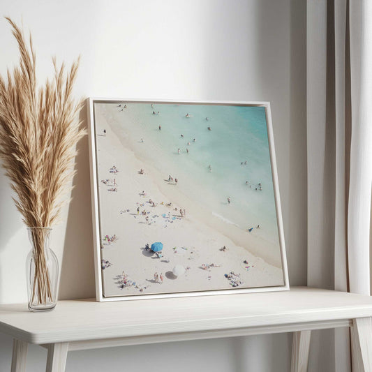 Minimalist Aerial Beach Scene with Soft Sand and Swimmers Canvas Print