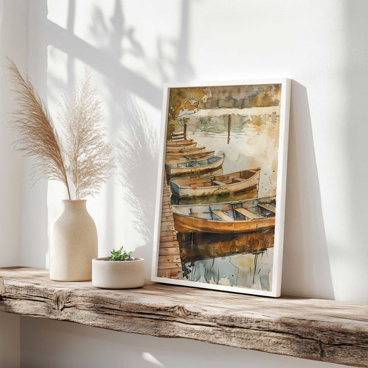 Boats on a Still Morning Lake Art Print