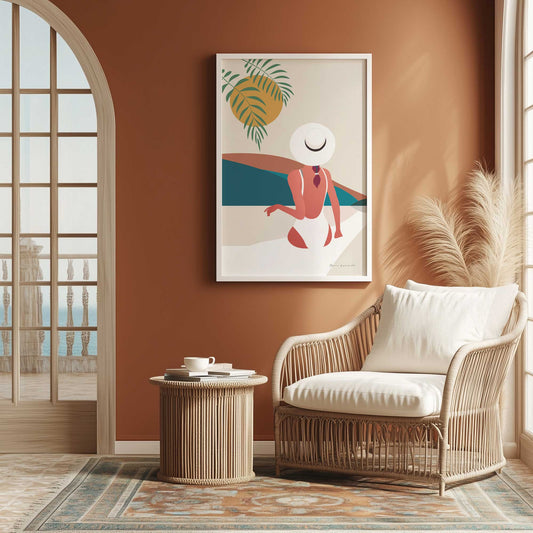 Vintage Beach Car with Surfboard and Palm Trees Print
