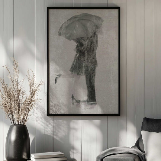 Romantic Couple Kissing Under Umbrella in Monochrome Art Print