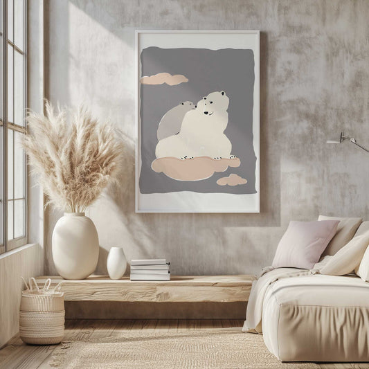 Polar Bear and Cub Resting on Peach-Colored Clouds Art Print