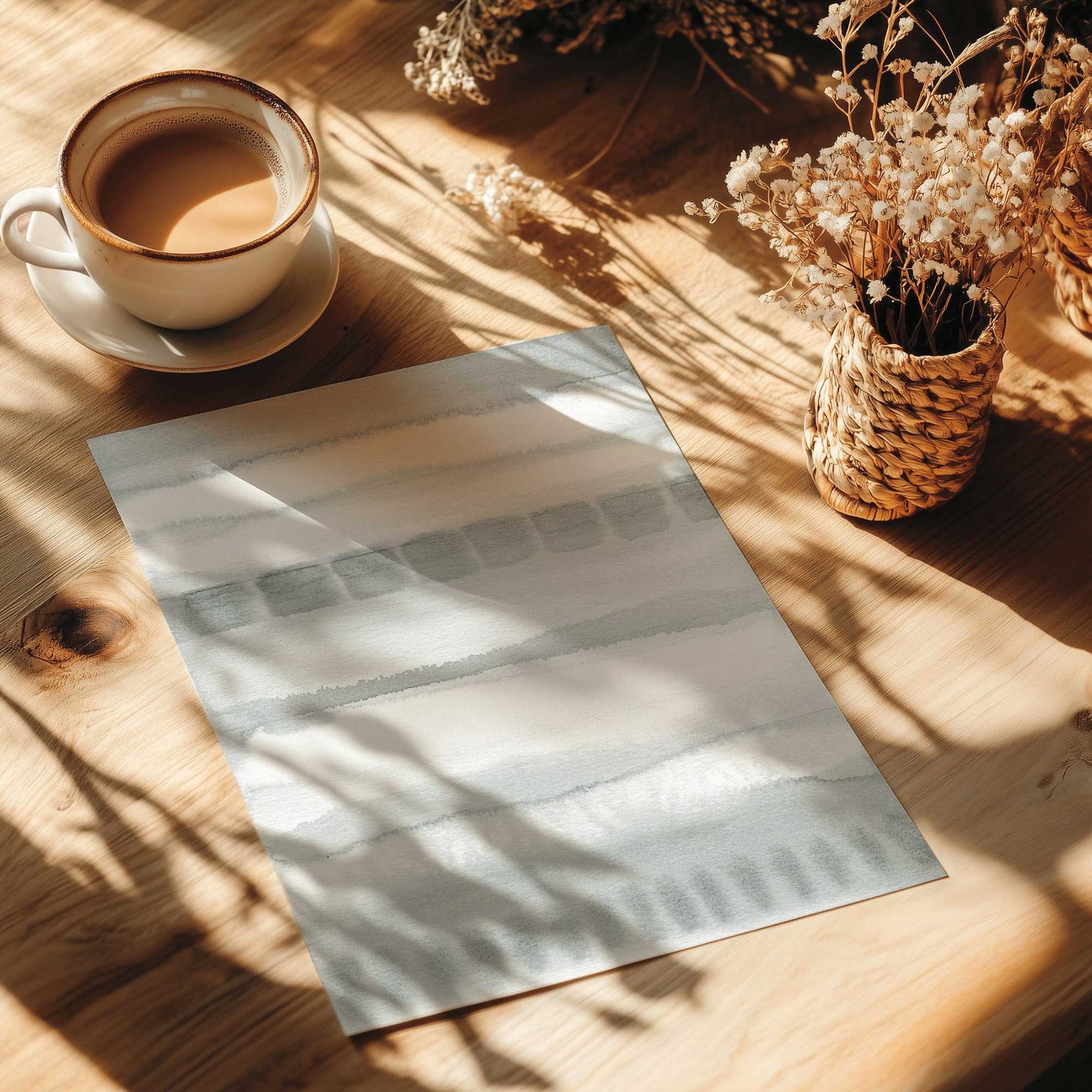 This piece is all about soft structure and peaceful vibes. Layers of watercolor stripes and a faded row of squares create a quiet rhythm that feels balanced and calming. The cool gray tones make it super easy to style with minimalist, modern, or Scandinavian decor. If you're into abstract geometric art that still feels warm and relaxed, this one adds a subtle pop without overwhelming your space. It’s clean, chill, and just the right mix of playful and peaceful.